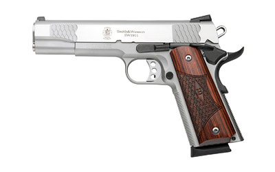 Smith & Wesson 1911, E Series, Semi-automatic, Single Action, 45 ACP, 5″ Barrel, Stainless Steel Frame/Slide/Barrel, Stainless Finish, Wooden Laminate E-Series Grip, 3 Dot Sight, 8 Rounds, 2 Magazines 108482