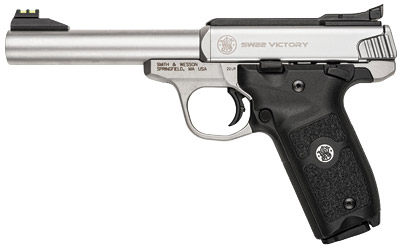 Smith & Wesson Victory, Semi-Automatic, 22LR, Single Action, 5.5″ Barrel, Satin Finish, Stainless Slide/Frame/Barrel, Thumb Safety, Adjustable Fiber Optic Front and Green Fiber Optic Rear Sights, 10 Rounds, 2 Magazines 108490